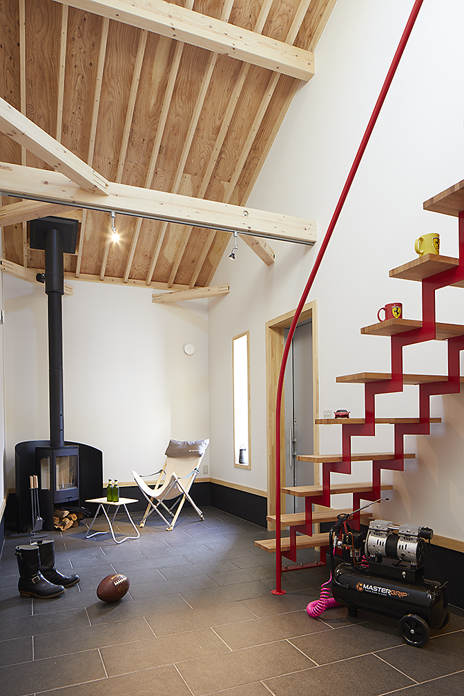こうして木造の温かみと機械的な無骨さが共存する、あまり例を見ないショールームのようなガレージハウスが完成しました。