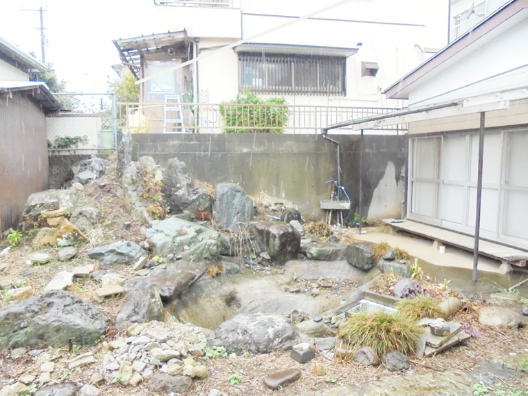 池の跡があり、上流から川が流れるようになっていました。この物件に住まわれていた方の庭造りに対する意気込みを感じますね。ポンプが見当たりませんでしたがまさか上水をかけ流ししていたのでしょうか??