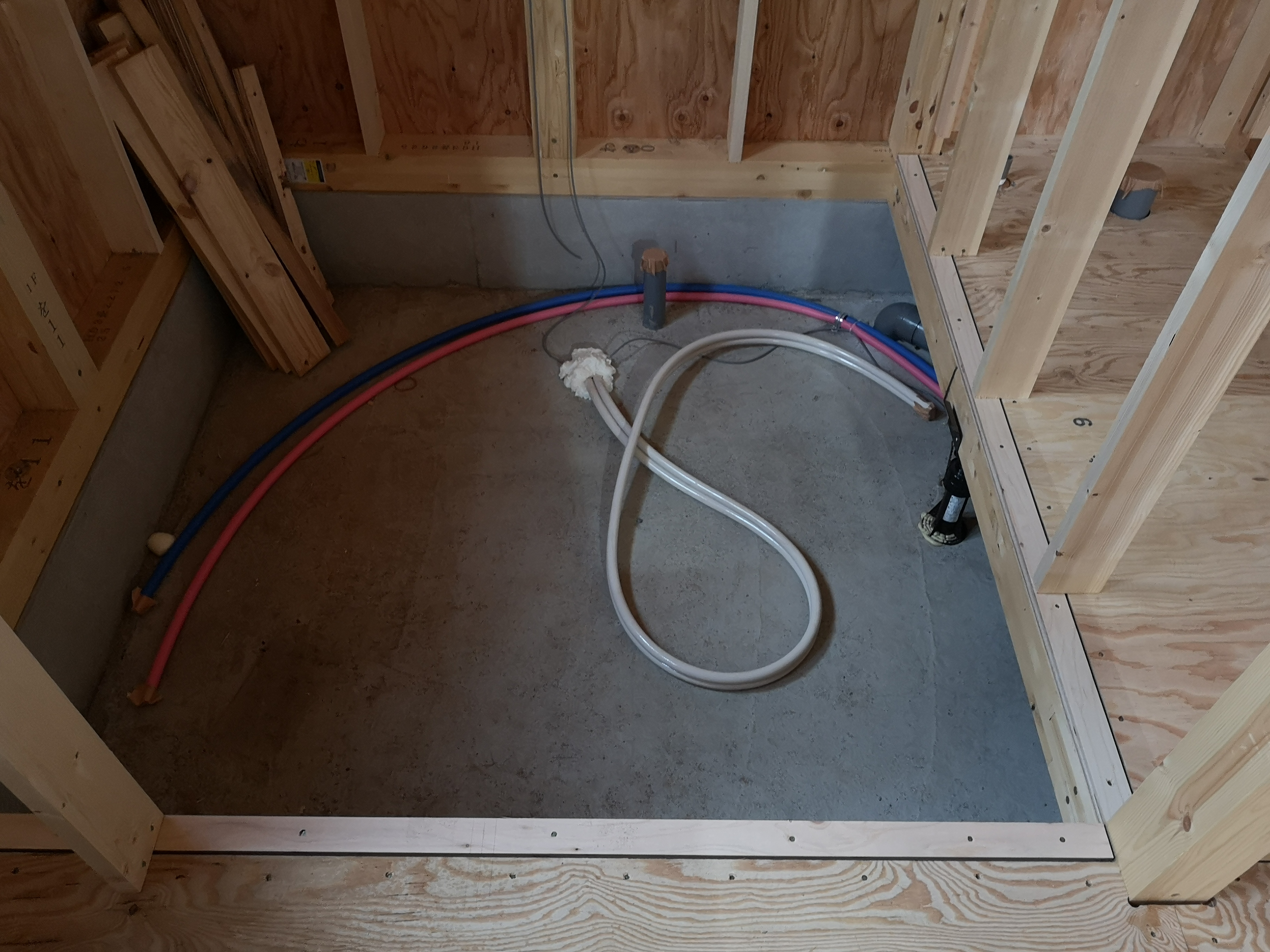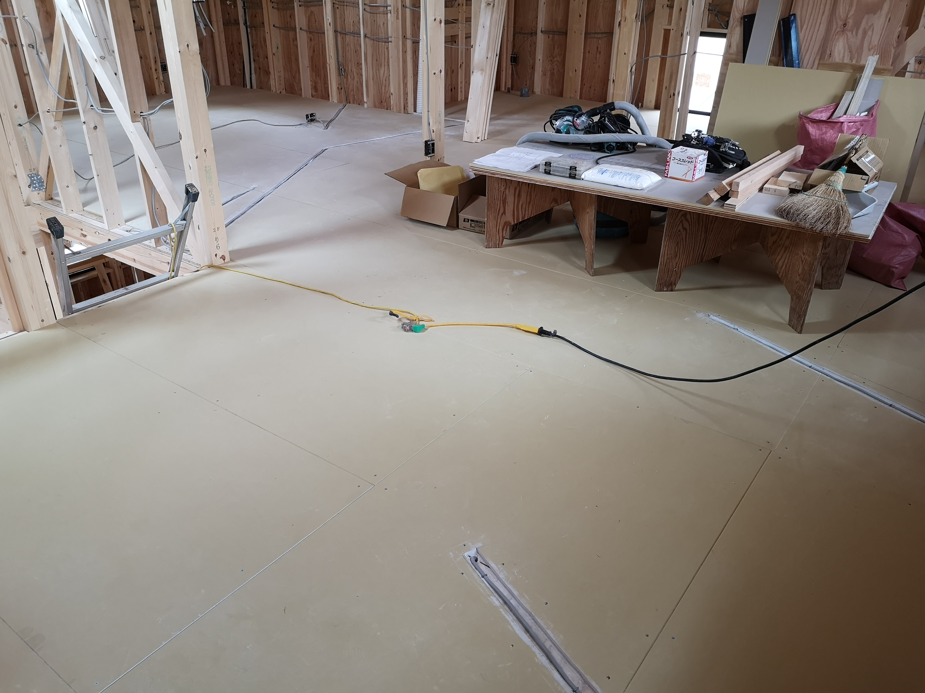2階床に石膏ボードを敷いていき、無垢材をはっていきます。